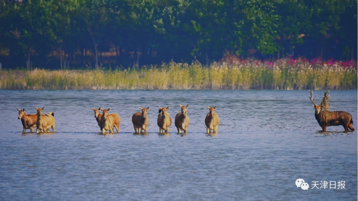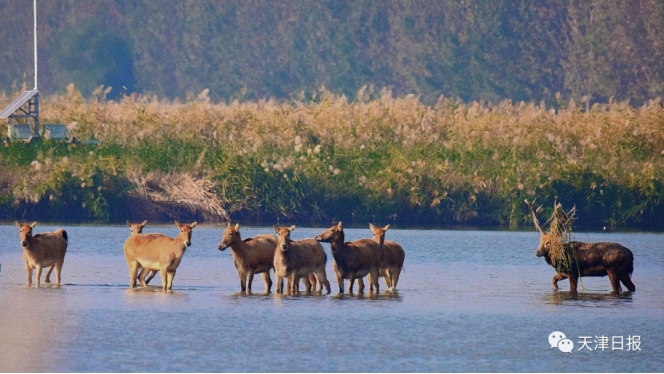 “看,麋鹿来啦!”说话间,远处芦苇荡出现了一群膘肥体壮的“四不像”。“一共有9头麋鹿,这是一个小群落。长着鹿角的是成年雄鹿。”站在苇塘边,赵大鹏介绍,“七里海湿地是麋鹿的天然食堂,良好的生态环境带来丰富的食材。研究麋鹿的食性和食谱对于保护这个物种至关重要。据七里海湿地自然保护区工作人员观测,目前的麋鹿种群已达到31头。”七里海湿地是“东亚—澳大利西亚迁飞区”候鸟迁徙路线的重要停歇地。生态环境好不好,鸟儿会用翅膀来“投票”。据七里海湿地自然保护区工作人员观测,当日已经有上万只候鸟飞临七里海湿地,其中,东方白鹳、天鹅、白琵鹭等珍稀鸟类超过2000只。