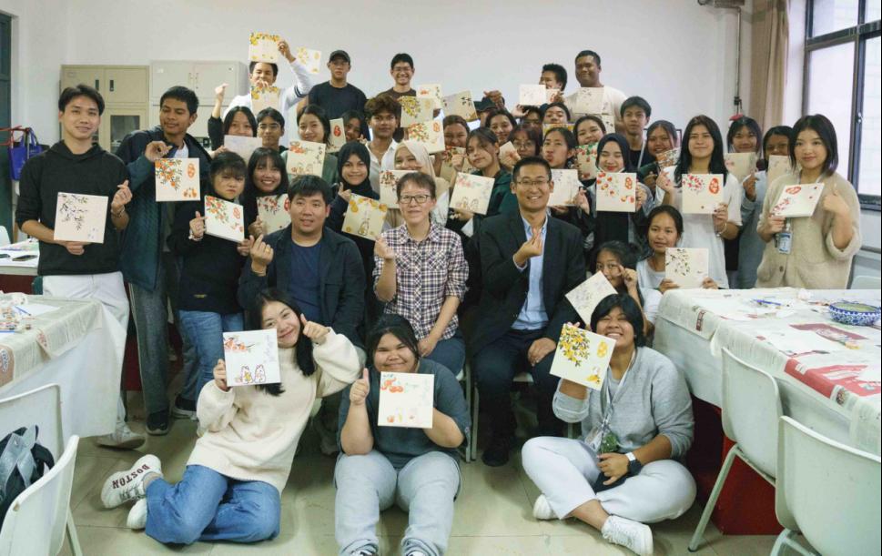 历史文化学院教师张方详细讲解了中文独特的谐音修辞现象、谐音图案以及中国传统吉祥图案的寓意与象征。交流营师生认真听取讲解,亲自动手体验,加深了对中华优秀传统文化的审美认知能力,感受到了中文之美、中国绘画之趣和中华优秀传统文化的无穷魅力。新颖的教学形式和生动有趣的教学内容受到了交流营师生的一致好评。