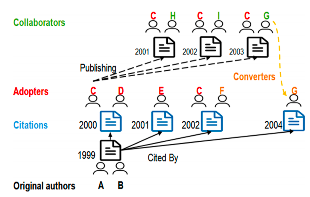 为探究这些问题,研究团队开创性地将“集体记忆理论”与“创新扩散理论”相融合,构建了基于引用的科学创新集体记忆网络,并在网络中定义了四类作者角色:原作者、采纳者、合作者和转化者。同时,研究引入了两个新的定量指标——采纳者转化率 (CRA) 和合作者转化率 (CRC),用于衡量合作网络中知识传递的效率。通过对引用模式、合作网络及转化率的综合分析,团队揭示了科学创新在合作网络中的传播路径与内在机制。